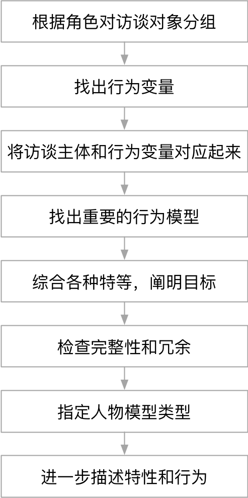 应该包括以下内容: - 行为本身(活动及其动机) - 使用环境 - 使用当前解决方案遇到的挫折和痛苦 - 行为相关联的人口统计学 - 行为相关的技巧、经验或能力 - 行为相关的态度和情感 - 同其他人、产品或服务相关的交互 - 做同样事情的替代或者竞争方案,尤其是类似技术